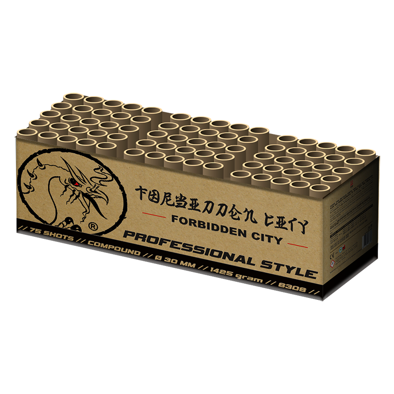 Forbidden CIty 75 shots 30mm. Deze compound is opgebouwd uit drie dikke 25 schots cakes, welke allemaal 30mm kaliber tubes hebben. Door deze 30mm kaliber tubes komen de effecten maximaal tot hun recht. Binnen de effecten van deze Forbidden City zitten mega dikke gouden staarten met gekleurde toppen, omringt door heldere strobes, hele heldere blinkerboeketten in gemixte kleuren, kopergouden palmen met schitterende strobes en als afsluiter helder en felrood gekleurde dahlia met maximale cracklingboeketten. Dit alles gecombineerd met een sierlijke mine, om niet alleen hoog, maar ook laag in de lucht de ruimte goed te benutten.