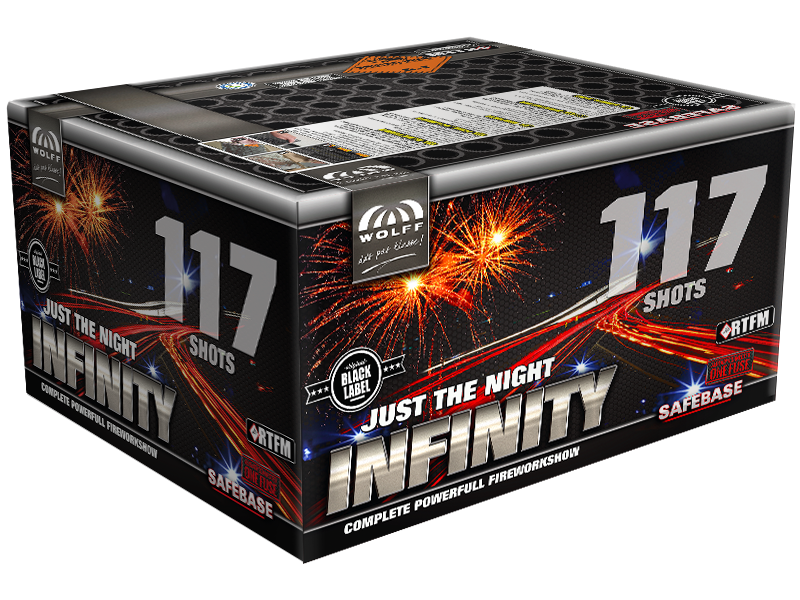 Infinity nDeze topper verdient een podium! Ongekend avondvullende vuurwerkshow met 117 shots. Spanning en sensatie gegarandeerd! n nKruitgewicht 1360 Gram nTube diameter 20 / 25 / 30 nBrandtijd 75 Seconden nHoogte 30 m. – 35 m. Infinity Goedkoop vuurwerk kopen bij Vuurwerkwinkel Castricum
