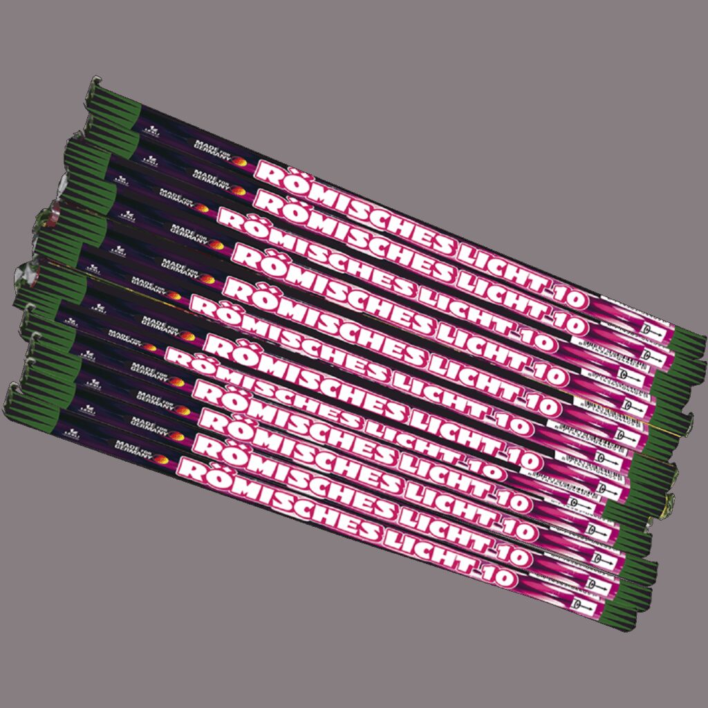 nRomeinse kaarsen met 10 bonte shots. 12 stuks per verpakking.nDit product is verboden in Nederland.