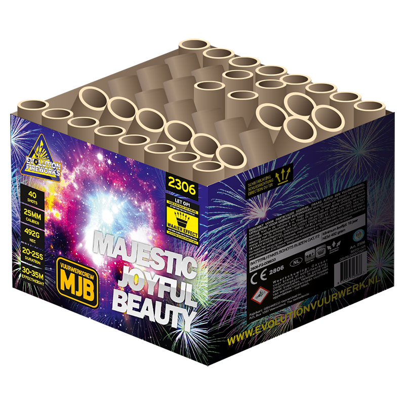 MJB Cake 40 shots 25mm n nEvolution Fireworks n nIn 2019 is de MJB cake uitgeroepen tot cake van het jaar! n nProductinformatie: nType product: Siervuurwerk nEffect product: Cake nTube diameter: 25mm nFanshape: Ja nClassificatie: CAT.F2 nMinimale leeftijd: 16 jaar nLegaal afsteken op: 31 december nVeiligheidsafstand: minimaal 8 meter nGeschikt voor smalle straten: Nee nGeschikt in Gemeente vuurwerkverbod: Nee MJB Cake 40 shots 25mm Goedkoop vuurwerk kopen bij Vuurwerkwinkel Castricum